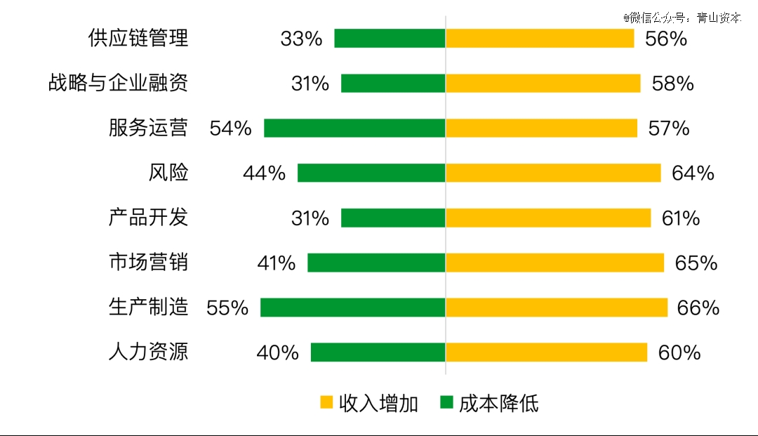 从行业来看,2023年人工智能在科技、媒体和电信行业的使用率更高;从职业种别看,人工智能在产物开发、市场营销和服务运营等方面的渗透率更高,平均跨越20%。凭证调研数据,人工智能在生产制造、服务运营、风险和市场营销方面显著降低了成本。人工智能可以用于改善客户体验并提升客服生产力、提高个性化定制和销售效率、改善产物模拟和测试等环节,未来更多场景的应用会使得成本进一步降低。