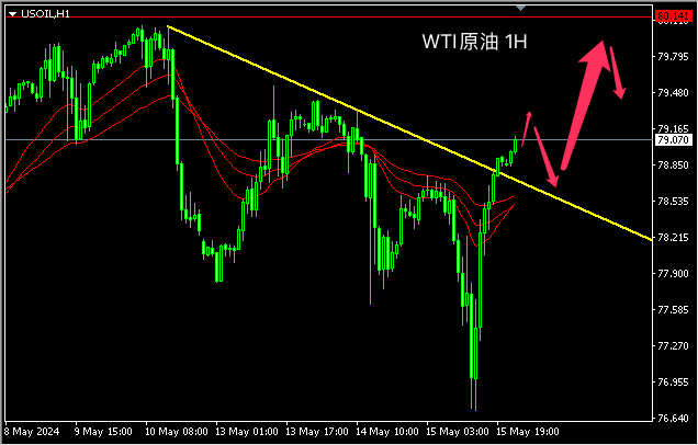 原油短线(1H)走势先跌后涨,一度跌破77支持,测试76.70新低,随即被快速收复上涨。油价上穿均线系统,短线客观趋势进入转换节奏。从主次节奏看,昨日形成主主交替,早盘油价多头动能显示强劲,预计日内原油小幅调整后,再度向80测试。