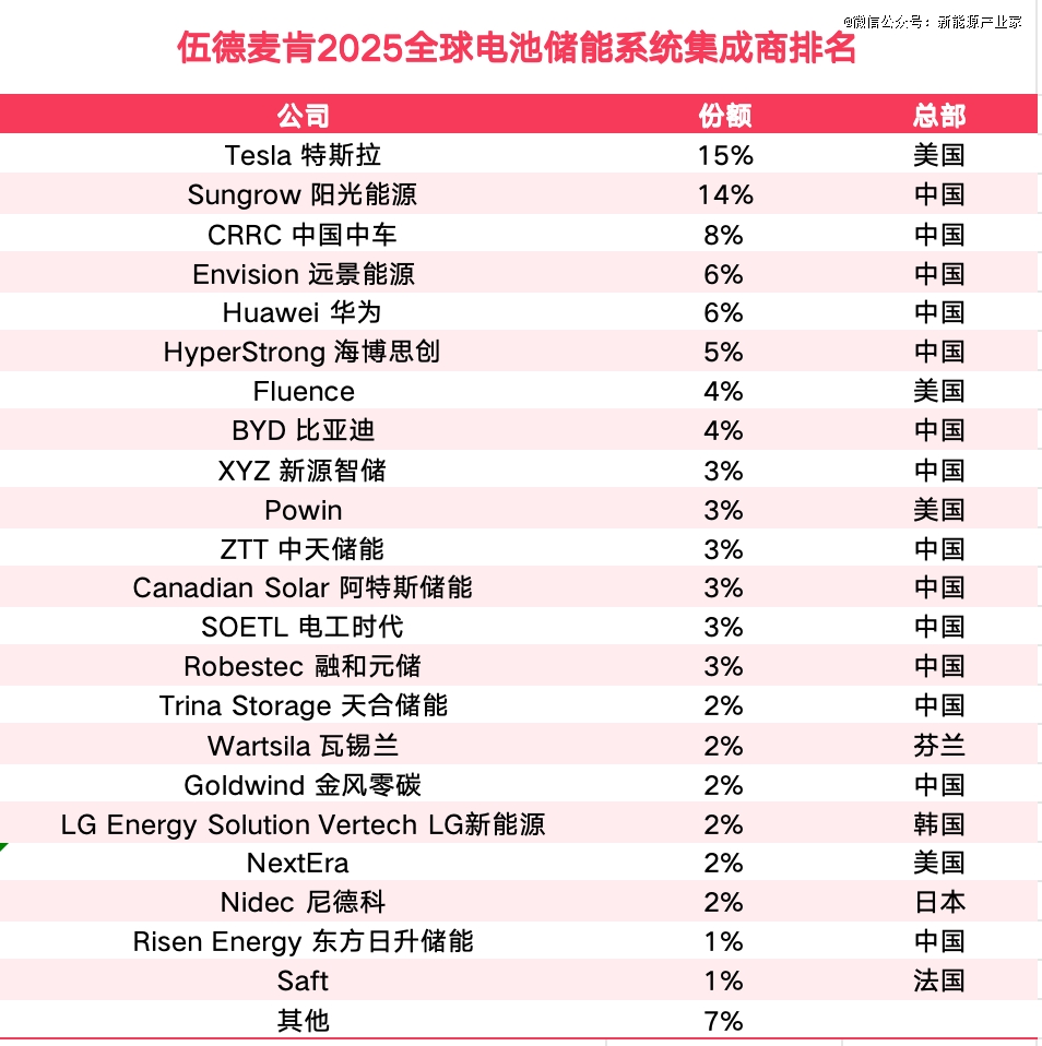 如今,这股力量已不容忽视——在伍德麦肯兹公布的2025年全球电池储能系统集成商排名中,天合储能、东方日升、阿特斯等光伏系企业已经崭露头角。