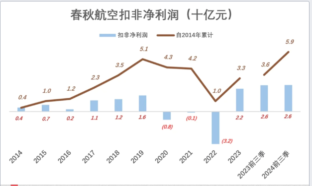 自2014年到2024年前三季,春秋航空净利润累计58.5亿;