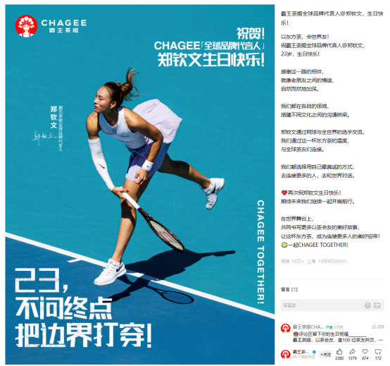 10月8日,据观察者网报道,在霸王茶姬官方公众号上注意到一张为网球名将郑钦文庆生的海报。海报中郑钦文的身份悄然变成“霸王茶姬全球品牌代言人”,2024年奥运会时,郑钦文的身份还是“全球健康大使”。