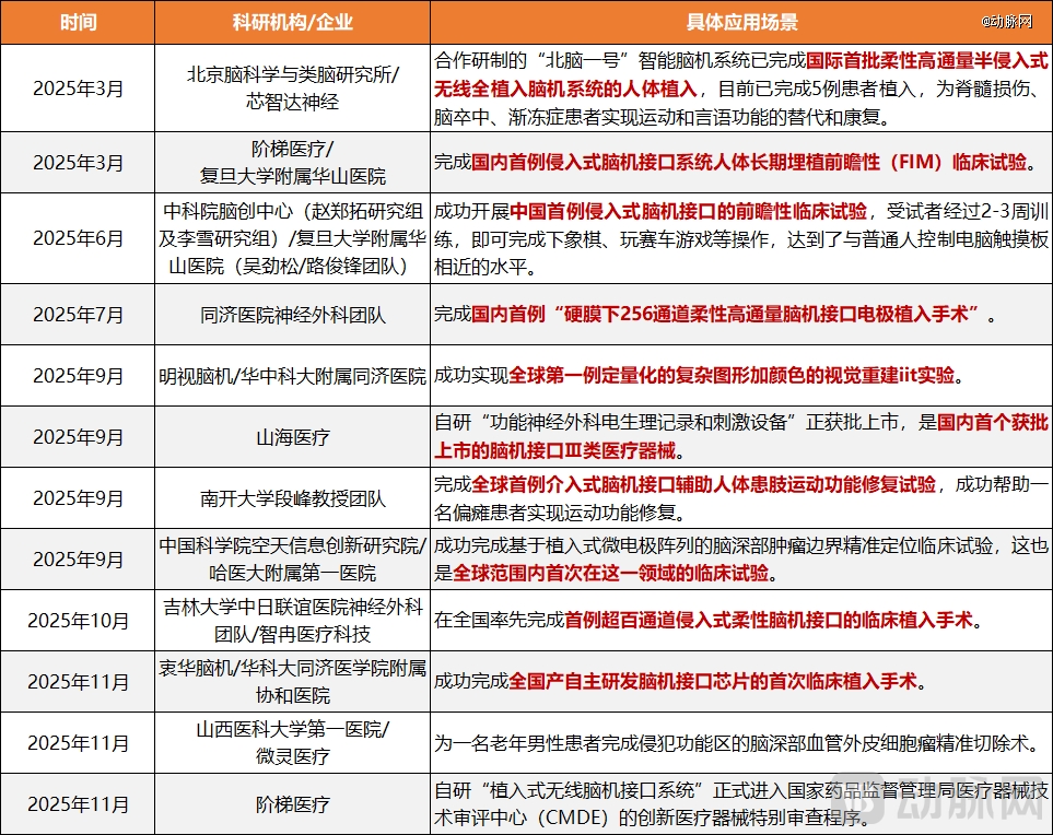 最后在关键的临床端,2025年更是遍地开花结果。3月,阶梯医疗在复旦大学附属华山医院成功完成国内首例侵入式脑机接口系统人体长期埋植前瞻性(FIM)临床试验;9月,南开大学段峰教授团队牵头的全球首例介入式脑机接口辅助人体患肢运动功能修复试验顺利完成,帮助一名偏瘫患者实现患肢运动功能修复;同样是在9月,明视脑机完成全球首例“复杂图形 多种颜色”的视觉重建IIT实验,成功实现视觉重建从简单光点到复杂图形甚至色彩感知的跨越;11月,衷华脑机与华中科技大学同济医学院附属协和医院联合完成全国产自主研发脑机接口芯片首例临床植入手术,并成功采集到患者大脑中感觉运动区域的神经信号。