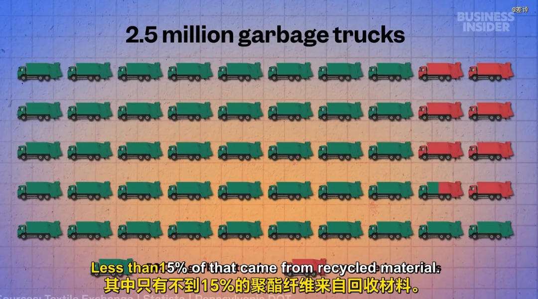 所以,现在绝大多数的聚酯纤维,都是直接从石油来的。全球只有不到 15% 的聚酯纤维是垃圾回收做的,大多还是品牌为了宣传环保,你想穿还穿不到。