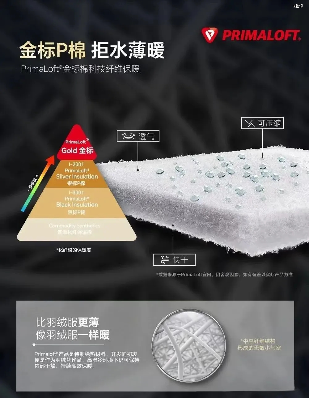 就比如大名鼎鼎的美国面料品牌 Primaloft,有一款经典材料 P 棉。它可不是打棉的擦边球,它的保暖性能是和羽绒对标的。